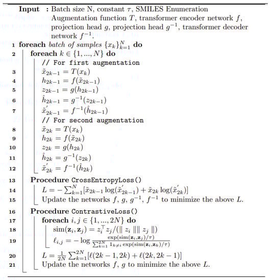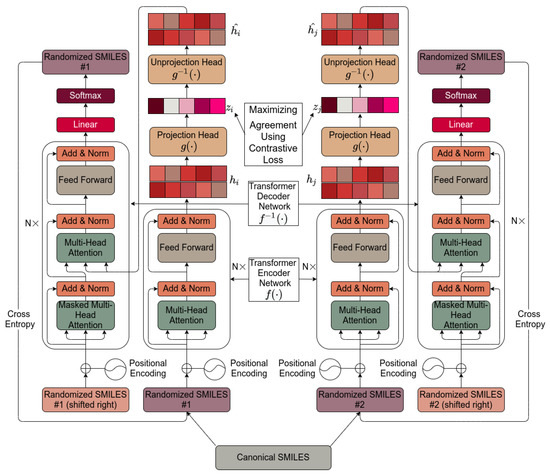where zi and zj are positive pair projection vectors when two transformer models are run in parallel. 𝟙 is a Boolean evaluating to 1 if k is not the same as i, and τ is the temperature parameter. Lastly, sim() is the similarity metric for estimating the similarity between zi and zj. The idea behind using this loss function is that when sampling a sample batch of data of size N for training, each sample is augmented as per subsection “Section 4.1” and the total would then be 2N samples. Therefore, for every sample there is one other sample from the same canonical SMILES and 2N-2 other samples. Therefore, we considered for every sample one other sample generated from the same canonical SMILES as a positive pair and each of the other 2N-2 samples as a negative pair.