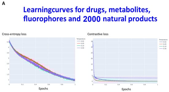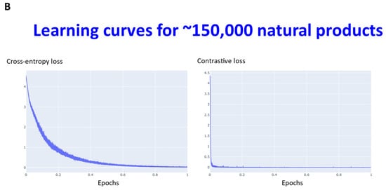 Transformers are computationally demanding (our largest network had some 4.68 M parameters), and so (as described in Section 4) instead of using 6M ZINC molecules (that the memory available in our computational resources could not accommodate), we studied datasets consisting overall of ~160,000 natural products, fluorophores, endogenous metabolites, and marketed drugs (the dataset is provided in [113]). We compared contrastive learning with the conventional objective function in which we used the evidence lower bound of the KL divergence. The first dataset (Materials and Methods) consisted of ~5000 (actually 4643) drugs, metabolites, and fluorophores, and 2000 UNPD natural products molecules, while the second consisted of the full set of ~150 k natural products. “Few-shot” learning (e.g., [114,115,116]) means that only a very small number of data points are required to train a learning model, while “one-shot” learning (e.g., [117,118,119,120,121]) involves the learning of generalizable information about object categories from a single related training example. In appropriate circumstances, transformers can act as few-shot [3,122,123], or (as here) even one-shot learners [124,125]. We thus first compared the learning curves of transformers trained using cross entropy versus those trained using contrastive loss (Figure 2). In each case, the transformer-based learning essentially amounts to one-shot learning, especially for the contrastive case, and so the learning curve is given in terms of the effective fraction of the training set. We note that recent studies happily imply that large networks of the present type are indeed surprisingly resistant to overtraining [126]. In Figure 2A the optimal temperature used seemed to be 0.05 and this was used for the larger dataset (Figure 2B). The clock time for training an epoch on a single NVIDIA-V100-GPU system was ca. 30 s and 23 min for the two datasets illustrated in Figure 2A and Figure 2B, respectively.
