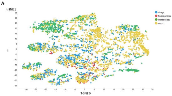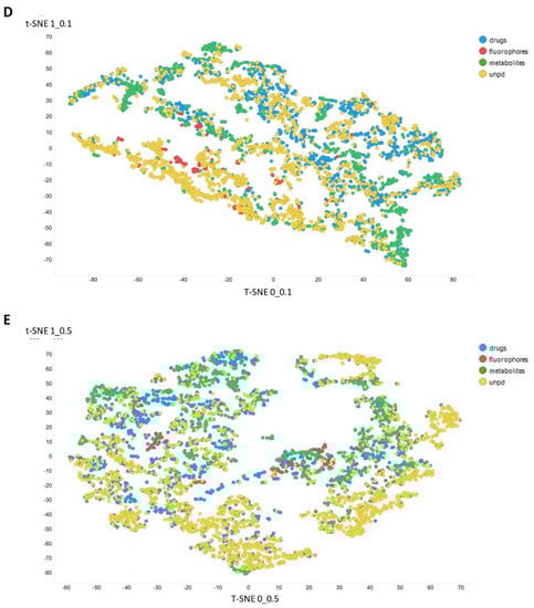 Figure 3 gives an overall picture using t-SNE [127,128] of the dataset used. Figure 3A recapitulates that published previously, using standard VAE-type ELBO/K-L divergence learning alone, while panels Figure 3B–E show the considerable effect of varying the temperature scalar (as in [112]).