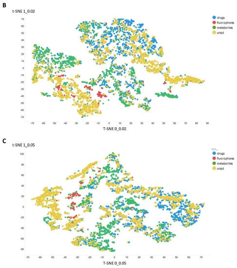 Effect of adjusting the temperature parameter in the contrastive learning loss on the distribution of molecules in the latent space as visualized via the t-SNE algorithm. For clarity, only a random subset of 2000 natural products is shown. (A) Learning based purely on the cross-entropy objective function. (B–E) The temperature scalar (as in [112]) was varied between 0.02 and 0.5 as indicated. (Reducing t below led to numerical instabilities.) All drugs, fluorophores, and Recon2 metabolites are plotted, along with a randomly chosen 2000 natural products (as in [113]).