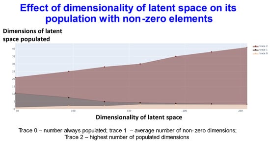 In Figure 4, trace 0 means that the elements of this number of dimensions was always nonzero. In other words, for every molecule, the value of at least that number of dimensions (the value on the y-axis) will be always non zero. Thus, for the 256-dimensional latent space three dimensions were always non-zero). Trace1 means the average of the number of dimensions that were non zero for the dataset. Finally trace2 gives the highest number of dimensions recorded as populated for that specific dimensional latent space. This shows (and see below) that while GPU memory requirements meant that we were limited to a comparatively small number of molecules in our ability to train a batch of molecules, the capacity of the network was very far from being exceeded, and in many cases some of the dimensions were not populated with non-zero values at all. At one level this might be seen as obvious: if we have 256 dimensions and each could take only two values, there are 2256 positions in this space (~1077). This large dimensionality at once explains the power and the storage capacity of large neural networks of this type.