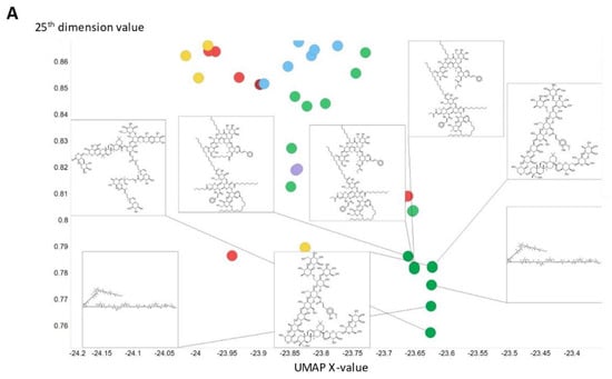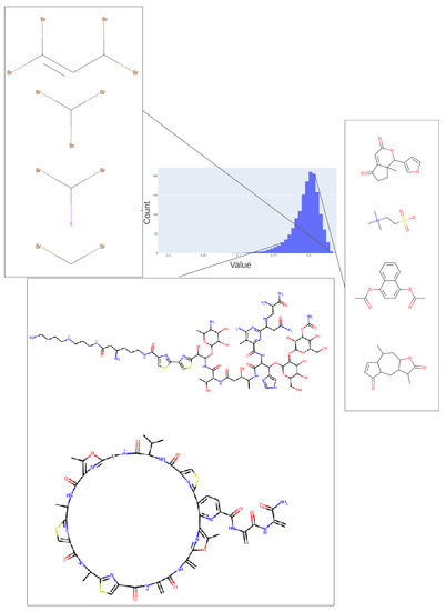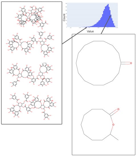 To illustrate in more detail the effectiveness of the disentanglement, we illustrated a small fraction of the values of the 25th dimension alone, as plotted against a UMAP [129,130] X-coordinate. Despite the tiny part of the space involved (shown on the y-axis), it is clear that this dimension alone has extracted features that involve tri-hydroxylated cyclohexane- (Figure 8A) or halide-containing moieties (Figure 8B).