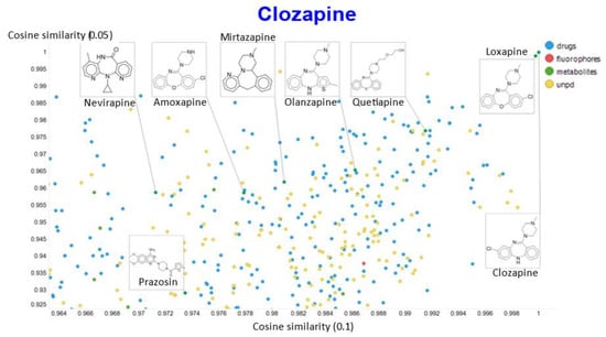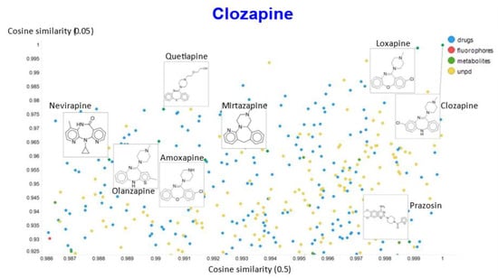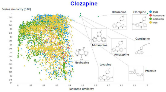 It is clear that (i) very few molecules showed up as being similar to clozapine in Tanimoto space, while prazosin (which competes with it for transport [131]) had a high cosine similarity despite having a very low Tanimoto similarity. In particular, none of the molecules with a high Tanimoto similarity had a low cosine similarity, indicating that our method does recognize molecular similarities effectively.