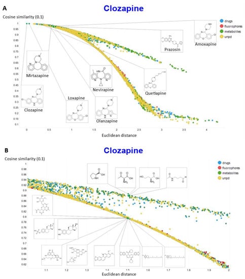 Another feature of this kind of chemical similarity analysis involves picking a molecule of interest and assessing what is “near” to it in the high-dimensional latent space, as judged by conventional measures of vector distance. We variously used the cosine or the Euclidean distance. As before [5], we chose clozapine as our first “target” molecule and used it to illustrate different feature of our method.