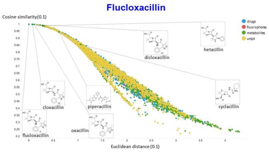 There is no “correct” answer for similarity methods, and as Everitt [172] points out, results are best assessed in relation to their utility. In this sense, it is clear that our method returns very sensible groupings of molecules that may be seen as similar by the trained chemical eye, and which in the cases illustrated (clozapine and flucloxacillin) clearly group molecules containing the base scaffold that contributes to both their activity and to their family membership (“apines” and “acillins”, respectively).