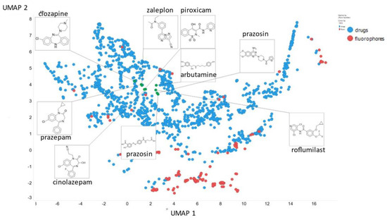 Finally, here we show (using for clarity drugs and fluorophores only (Figure 20)) the closeness of chlorpromazine and prazosin in UMAP space when the NT-Xent temperature factor is 0.1.