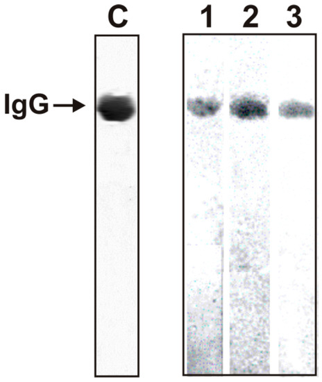 As previously was shown, the optimal substrates for IgG antibodies with peroxidase activity from the blood of healthy rats [31,32,33,34,35,36], healthy donors, and patients with AIDs are 2,2′-azino-bis(3-ethylbenzothiazoline-6-sulfonic acid (ABTS), 3,3′-diaminobenzidine (DAB), and o-phenylenediamine (OPD) [37,38,39]. To prove that mouse IgGs’ peroxidase activity is their intrinsic property and is not due to co-purifying enzymes, we have applied strict criteria. IgGmix (IgGmix preparations; mixtures of 21 IgG preparations after mice treatment with MOG [9], DNA-metBSA [10], and DNA-histones [11]) were electrophoretically homogeneous (Figure 1, lane C).