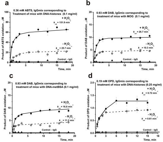Typical examples of the time-dependences of products formation in the reaction of three substrates (ABTS (a), DAB (b,c), and OPD (d)) oxidation catalyzed by IgGmix preparations in the presence and in the absence of H2O2. All designations are given on Panels a–d.