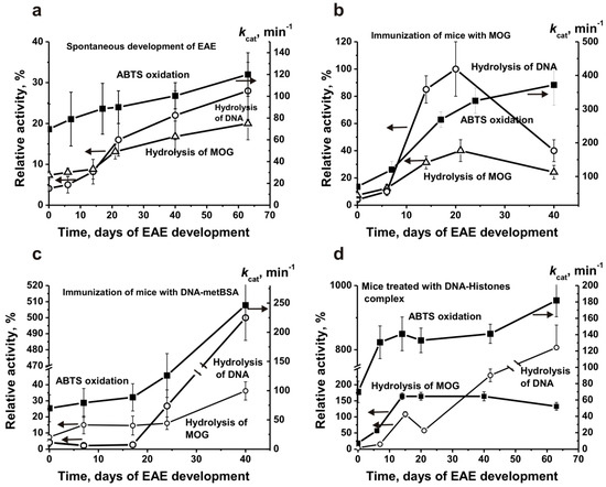 Over time changes in the relative activity (5 of the hydrolysis) of IgGs against DNA and MOG in the hydrolysis of these substrates (a–d; left scales) as well as oxidation of ABTS (kcat, min−1; a–d; right scales). The mean values of the activities of IgGs from seven mice during spontaneous (a) as well as accelerated development of EAE after immunization of mice with MOG (b), DNA-metBSA (c), and DNA-histones (d) are given. All designations are marked in the Panels: the arrows in the Panels indicate to which Y axis the given curve belongs to the right or to the left.