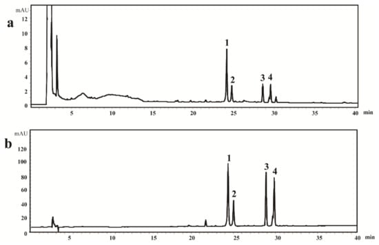 The typical HPLC chromatograms of: (a) Dioscoreae Nipponicae Rhizoma sample and (b) four steroidal saponins reference standards. (1. protodioscin, 24.15 min; 2. protogracillin, 24.77 min; 3. pseudoprotodioscin, 28.60 min; and 4. Pseudoprotogracillin, 29.56 min).