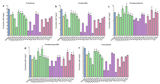 Extraction yields of different solvents for (a) protodioscin, (b) protogracillin, (c) pseudoprotodioscin, (d) pseudoprotogracillin, and (e) four total steroidal saponins. Error bars indicate the standard deviations (n = 3). Extraction yields of NADESs compared with water are indicated with # p < 0.05, mean value > water and * p < 0.05, mean value > methanol.