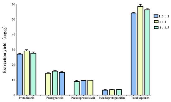 The molar ratio of HBAs and HBDs has been regarded as an important factor that influences the surface tension and polarity of NADESs [24], which could affect the extraction efficiency of target components from natural biomass. As described above, ChCl-Mal produced the highest extraction efficiency of steroidal saponins from DNR. The molar ratios of ChCl-Mal were further investigated. The eutectic mixtures of ChCl-Mal were prepared at mole ratios of 2:1, 1.5:1, 1:1, 1:1.5, and 1:2, and homogeneous and transparent liquid could be synthesized with 1.5:1, 1:1, or 1:1.5 mole ratios. Thus, the ChCl-Mal with the mole ratios 1.5:1, 1:1, and 1:1.5 were used to extract bioactive steroidal saponins from DNR. As shown in Figure 3, the results indicated that the different molar ratios of ChCl-Mal have impact on the extraction yields of protodioscin and protogracillin, but have no impact on pseudoprotodioscin and pseudoprotogracillin. The optimal molar ratio of ChCl-Mal was 1:1 and the extraction yields of protodioscin, protogracillin, pseudoprotodioscin, and pseudoprotogracillin were 29.30 ± 0.67, 15.86 ± 0.37, 9.71 ± 0.23, and 3.66 ± 0.07 mg/g, respectively.