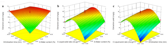 Response surface plots of the model for extraction of steroidal saponins from Dioscoreae Nipponicae Rhizoma (DNR). (a) water content (%) and extraction time (min); (b) water content (%) and liquid-solid ratio (mL/g); (c) liquid-solid ratio (mL/g) and extraction time (min).