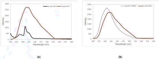 (a) Emission spectra of empty PLGA nanoparticles (black line) and oxyresveratrol-loaded PLGA nanoparticles (red line) collected in phosphate buffer saline pH 7.4. (b) Overlapping between free oxyresveratrol emission pattern in DMSO (gray line) and oxyresveratrol encapsulated in PLGA nanoparticles (red line).