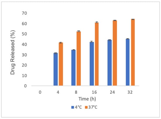Oxyresveratrol release by PLGA nanoparticles: average cumulative data at 4 °C (blue bars) and 37 °C (orange bars) in phosphate buffer saline pH 7.4; each sample was collected at the indicated time points. Data were acquired in triplicate and are expressed as the mean value ± SD.