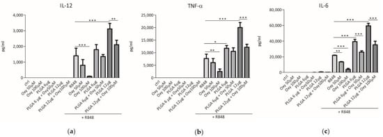 2.3. The Insertion of Oxyresveratrol in PLGA Nanoparticles Inhibited the Synergy between These Particles and R848 in Induction of Cytokine Release by DCs