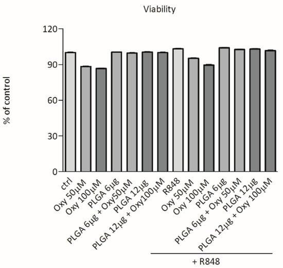 To exclude that our results on cytokine release could be due to toxic effects we examined whether oxyresveratrol alone or inserted into PLGA nanoparticles would affect the DC viability. For this purpose, DCs were challenged with free oxyresveratrol, bare PLGA nanoparticles, or oxyresveratrol-loaded PLGA nanoparticles in absence or presence of R848 as in the experiments depicted in Figure 3 and cell viability was assessed using the Cell Proliferation Reagent WST-1 assay. Figure 4 shows that in these experimental conditions the DC viability was not or only slightly altered.