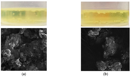 Visual and scanning electron microscopy images of the digestion solution after mineralisation: (a) non-decomposed tissue; (b) partially decomposed tissue.