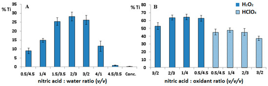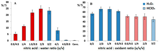 Recovery of titanium (%) using (A) different concentrations of nitric acid; (B) different mixtures composed of nitric acid/hydrogen peroxide and nitric acid/perchloric acid.