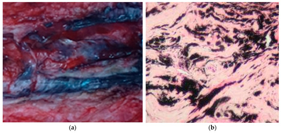(a) Sample of paraspinal tissue from patients with implants; (b) histopathological preparation showing black metal deposits in the intercellular spaces of tissue.