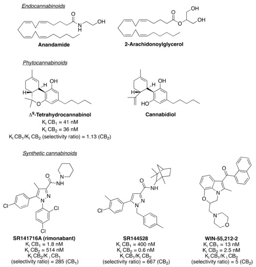 Cannabinoids are a class of different chemical compounds (Figure 1), including the endocannabinoids (produced naturally in the body by humans and animals such as anandamide and 2-arachidonoylglycerol), the phytocannabinoids (derived from Cannabis, exemplified by Δ9-tetrahydrocannabinol, the major psychoactive component of Cannabis sativa, commonly known as marijuana), and the synthetic cannabinoids (produced chemically by human, comprising a wide array of chemical entities, i.e., the pyrazole-based compounds SR141716A and SR144528 and the indole based compound WIN-55,212-2) [1,2,3]. The physiological and behavioral effects of cannabinoids appear directly correlated to their affinity towards two different classes of specific receptors: CB1 receptors located predominantly in the central nervous system [4], and CB2 receptors which are mostly found in peripheral tissues [5]. In the brain, the CB1 receptors are abundantly expressed in the hippocampus, cerebellum and striatum [6,7]. Among the peripheral tissues wherein the CB1 receptors have been found, the enteric nervous system [8], testis, urinary bladder, vas deferens can be mentioned [9]. CB1 receptor mRNA and protein have been furthermore identified in the rat and human eye, both in the retina and in the iris, and in the ciliary body [10]. CB2 receptors are located in the marginal zones of the spleen, tonsils, immune cells [9,11] and to a much lesser extent in CNS [12]. Furthermore, CB2 receptor mRNA was expressed in the adult rat retina, including the somas of retinal ganglion cells [13].