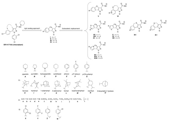- Lazzari, P.; Distinto, R.; Manca, I.; Baillie, G.; Murineddu, G.; Pira, M.; Falzoi, M.; Sani, M.; Morales, P.; Ross, R.; et al. A critical review of both the synthesis approach and the receptor profile of the 8-chloro-1-(2′,4′-dichlorophenyl)-N-piperidin-1-yl-1,4,5,6-tetrahydrobenzo(6,7)cyclohepta(1,2-c)pyrazole-3-carboxamide and analogue derivatives. Eur. J. Med. Chem. 2016, 121, 194–208. [Google Scholar] [CrossRef]