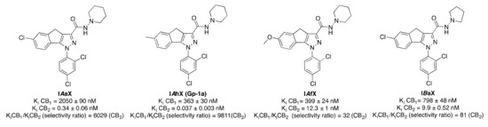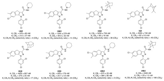 Furthermore, 1,4-dihydroindeno(1,2-c)pyrazoles featuring a cyclopropyl or cyclohexyl building block in C6 position were investigated by us, in order to evaluate the effect of cycloalkyl moiety in place of methyl group both on cannabinoid receptor binding and activity [29]. The most interesting compounds coming from this fourth series are depicted in Figure 6. Whereas, these analogs provided further insight regarding the structural features for CB2 affinity and selectivity, our data evidenced that the introduction of a cyclopropyl moiety in most of the synthesized compounds seemed to play a modest role in lowering the CB2 receptor affinity, especially if compared to compound IAhX. Interestingly, intrinsic activity for compounds IAlX, IHlX, ILlX, IJlX, evaluated by GTPγS binding assay, showed antagonist/inverse agonist properties (IC50 for compound IAlX = 294 nM, for IHlX = 80 nM, for ILlX = 27 nM and for IJlX = 51 nM).