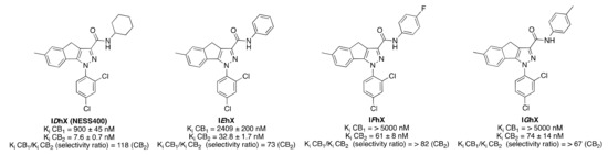 Our results prompted us to investigate new 1,4-dihydroindeno(1,2-c)pyrazoles (I), which were obtained modifying the N-carboxamide moiety (Q) and the aryl substitution of the lead compounds IAaX and IAhX [24]. In general, our SAR study showed that the CB1 receptor affinities of all the investigated compounds were lower than their CB2 receptor affinities, evidencing the suitability of 1,4-dihydroindeno(1,2-c)pyrazole architecture to generate ligands for CB2 receptor interaction. Representative compounds of this series are IDhX, IEhX, IFhX, IGhX (Figure 4), all displaying high CB2 affinity and reasonable selectivity over CB1 receptors, even if lower than that elicited by compounds IAaX and IAhX.