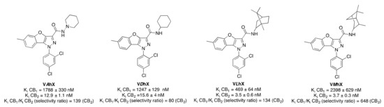 Structure of representative benzofuro(3,2-c)pyrazol-based derivatives (V). Affinities at CB1 and CB2 receptors were assessed by competition of (3H)-CP 55,940 in mouse cerebellum membranes and in mouse spleen homogenates, respectively [38].