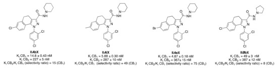 The intriguing SAR study carried out on ligands with the 1,4-dihydroindeno(1,2-c)pyrazole core (i.e., IAaX, IAhX) endowed with very high binding affinity for CB2 receptors in comparison to homologous ligands having 4,5-dihydro-1H-benzo(g)indazoles (i.e., IIAbX, IIAiX) exhibiting higher CB1 binding affinity, prompted us to design and synthetize a new homologous series of general formula III, incorporating 1,4,5,6-tetrahydrobenzo(6,7)cyclohepta(1,2-c)pyrazole scaffold, for cannabinoid receptor interaction [61]. Representative compounds are depicted in Figure 14. Compound IIIAcX, namely NESS0327, was first claimed by Sanofi-Aventis, but no biological data was presented in the patent [58].