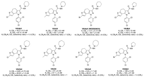 A number of compounds sharing a 4,5-dihydro-1H-thieno(2,3-g)indazole scaffold (VIII), which is a homolog of the previously-described 1,4-dihydrothieno(2′,3′-4,5)cyclopenta(1,2-c)pyrazole one (VII) were claimed by Neuroscienze Pharmaness S.C.A.R.L. [59]. The structure of representative compounds and CB1/CB2 receptor affinity values are reported in Figure 12. According to binding data, most compounds exhibited a potent and mixed CB1/CB2 binding profile, with a proclivity for CB1 receptors. The thieno(2,3-g)indazole-based derivative VIIIAeX resulted in the most selective for CB1 receptors between all reported compounds. The disclosed compound VIIIAeX, namely NESS038C6, highlighted CB1 antagonism behavior by both in isolated organ assays and in vivo tests based on rat intestinal motility (data not shown). Chronic treatment with NESS038C6 in C57BL/6N diet-induced obesity (DIO) mice determined a significant reduction of weight which was comparable to that detected in DIO mice treated with SR141716 [60]. The Neuroscienze Pharmaness S.C.A.R.L. patent [59] encompasses also a series of isomeric compounds incorporating the 4,5-dihydro-1H-thieno(3,2-g)indazole scaffold XI (i.e., XIAbX, Figure 2) and others, but not cannabinoid binding receptor affinity was reported.
