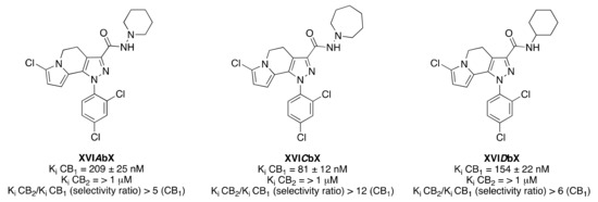 To further extend SAR study on cannabinoid receptors, and driven by the negligible results on CB1/CB2 receptor affinity of 1,4-dihydropyrazolo(3,4-a)pyrrolizines (XV), homologue 4,5-dihydro-1H-pyrazolo(4,3-g)indolizines (XVI, Figure 2) have been synthesized [56]. Representative compounds are depicted in Figure 13. According to binding data reported for compounds XVIAbX, XVICbX, XVIDbX with respect to compounds XVAaX, XVAhX, XVIaX, XVIhX, the expansion of the central ring size by a methylene unit led to conformational changes that promote the affinity for CB1 receptors and improve CB2/CB1 selectivity ratio, with XVICbX reaching reasonable affinity for CB1 receptors (Ki CB1 = 81 nM) and the highest CB2/CB1 selectivity ratio (>12).