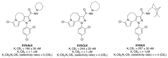 A series of 1,4,5,6-tetrahydropyrazolo(3,4-c)pyrrolo(1,2-a)azepine-based derivatives (XVII, Figure 2) has been investigated for cannabinoid receptor interaction [56]. Representative compounds are depicted in Figure 16, all devoid of affinity for CB2 receptors and endowed of negligible affinity for CB1 receptors.