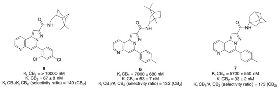 Compounds 5–7 exhibited affinity levels for CB2 receptors in the near nM range (Ki: 33–67 nM) with a good degree of selectivity for CB2 receptors compared to CB1. According to in vitro assays based on the effects of forskolin-stimulated cAMP levels in human CB2 CHO cells, compounds 5–7 exhibited antagonist/inverse agonist properties [79].