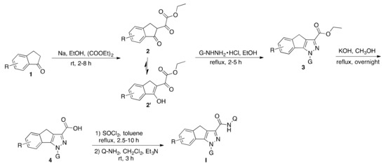 Compounds I were synthesized starting from the appropriate ketones 1 (Scheme 1) which were α-acylated by Claisen reaction, furnishing 1,3-diketoesters 2 as a tautomeric equilibrium shifted towards the alkenylidene structure (2′). The cyclization with appropriate hydrazines in refluxing EtOH gave the tricyclic dihydroindeno(1,2-c)pyrazole esters 3, which were hydrolyzed with KOH, affording the corresponding acids 4. Target compounds I were synthesized by condensation of acids 4, previously activated to acyl chlorides with SOCl2, with the appropriate amines.