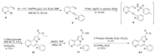 The pyrazolo(5,1-f)(1,6)naphthyridine derivatives were synthesized making use of AgOTf and proline-cocatalyzed multicomponent methodology (Scheme 2), starting from the appropriate o-alkynylaldehydes 9, p-toluenesulfonyl hydrazide (PTSH) and ethyl pyruvate, to gave key pyrazole-esters 10 which, hydrolyzed with NaOH, afforded the corresponding acids 11. Target compounds were synthesized by condensation of acids 11, previously activated with pivaloyl chloride, with the appropriate amines. The o-alkynylaldehydes 9 were obtained from 2-bromonicotinaldehyde 8 and appropriate alkynes which were reacted under the conventional Sonogashira conditions.