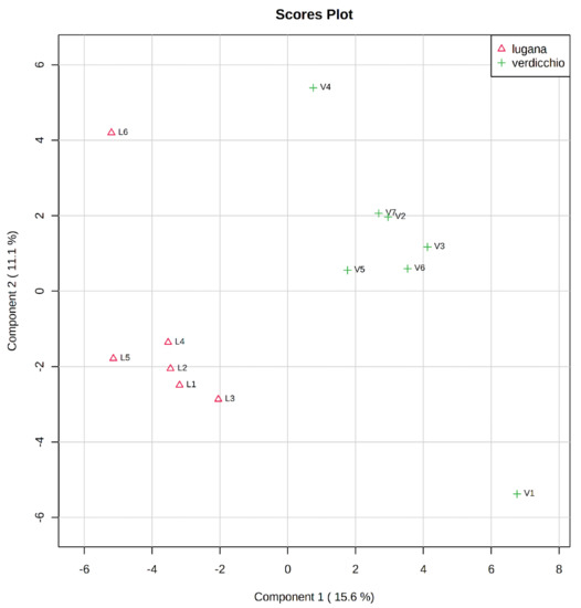 Lugana and Verdicchio are two Italian PDO white wines. Lugana vineyards are located in the north of Italy, close to the Garda lake in an area spreading across the Veneto and Lombardia regions. Verdicchio is produced in Marche region, in Central Italy. The grapes used for the production of these wines are locally identified with different names, specifically “Trebbiano di Soave” or “Turbiana” for Lugana and “Verdicchio” for Verdicchio. However, although ampelographic descriptions suggested that these could be different grapes, genetic analysis indicated that they are identical varieties [25,26,27]. The different phenotypes observed do not appear indeed to be due to genetic differences, but to different biotypes of the same variety [25]. Few papers investigated the aroma of Verdicchio [28] and Lugana [29,30]. According to Carlin et al. [28], young Verdicchio wines were characterized by fruity, thiolic notes that during aging evolve towards balsamic and anise notes related to the presence of 3-methyl-2,4-nonanedione and methyl salicylate. Among the compounds more relevant for Lugana wine aroma, ethyl esters and norisoprenoids were found to play a major role [29]. Moreover, the varietal thiols 3-mercaptohexan-1-ol (3MH) and 3-mercaptohexyl acetate (3MHA), have been found in Lugana wines above their odor threshold [30]. A marker of this grape variety and so of both Lugana and Verdicchio wines, is methyl salicylate, a benzenoid characterized bybalsamic odors [28]. Lugana and Verdicchio exist on the market as two distinct products associated with individual PDOs. However, no comparison between the aromatic profiles of the two wines has been reported out so far. The question remains therefore open as to whether a chemical and sensory space specific of each one of these two PDOs really exists.