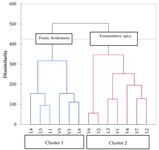 The attributes most cited in Cluster 2 were fermentative and spicy. Contrary to what was expected, the aromatic series fermentative, vinous, and spicy were not significantly different between the two clusters. In fact, the aromatic series “vinous” and “fermentative” showed similar values. However, it is however possible that he descriptor “fermentative”, characterizing Cluster 2, was not related to a higher concentration of some compounds, but to a lower content of compounds with a fruity character (esters, norisoprenoid), so that the generic fermentative character was more expressed in Cluster 2 [70].