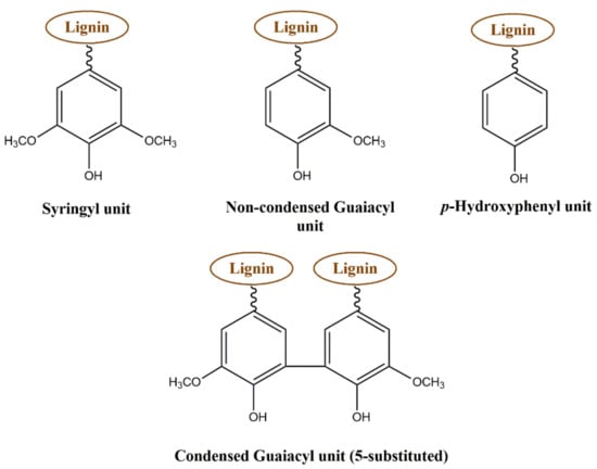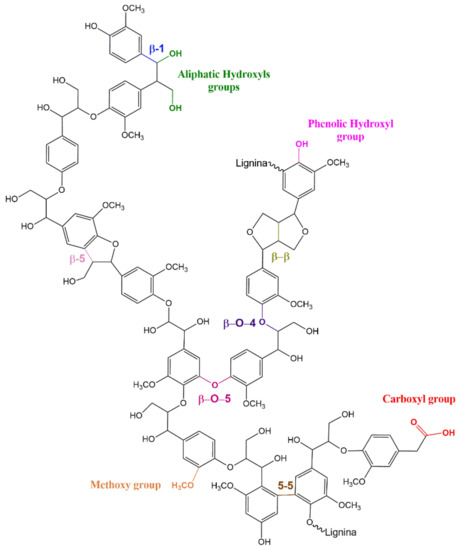 Lignin is an abundant natural polymer present in plant cells, together with cellulose and hemicellulose. Its amorphous structure is mainly composed by guaiacyl (G-unit), syringyl (S-unit) and p-hydroxyphenyl (H-unit) aromatic units, which are linked by carbon−carbon (β–5, 5–5, β–1 and β–β) and carbon−oxygen linkages (β–O–4, α–O–4 and 4–O–5) [19]. In addition, lignin also presents several functional groups: aliphatic and phenolic hydroxyls, carboxyl and methoxyl groups. There are innumerous possible combinations between basic units arising from different synthetic pathways, which make the macromolecule structure complex and heterogeneous [20]. Lignin structure is illustrated in Figure 1. The principal chemical linkages and functional groups are highlighted.