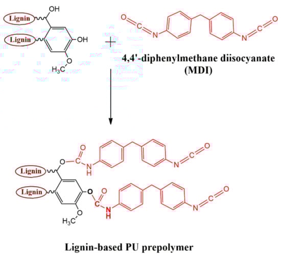 Urethanization reaction of lignin with 4,4′-diphenylmethane diisocyanate (MDI).