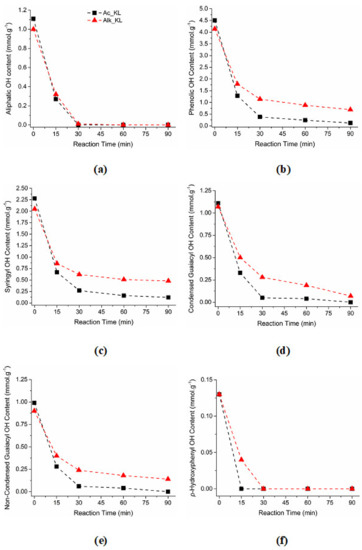 Evolution of hydroxyl group consumption as a function of reaction time during the reaction of Ac_KL and Alk_KL with MDI: (a) aliphatic hydroxyl group; (b) phenolic hydroxyl group (total); (c) syringyl phenolic hydroxyl group; (d) condensed guaiacyl phenolic hydroxyl group; (e) noncondensed guaiacyl phenolic hydroxyl group; (f) p-hydroxyphenyl phenolic hydroxyl group.