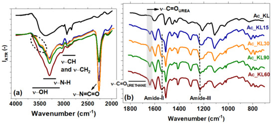 The carbonyl band showed a modest increase with MDI-modification. The same was observed for amide-II and amide-III bands, which appeared only as a shoulder on the peaks from Alk_KL structure (gray rectangles in Figure 6b). Accordingly, no peak assigned to urea could be seen in the spectra. Although no indication of urea formation was identified in the spectra, we do not claim that this group was not formed during the reaction between lignin and MDI. Considering that this reaction was carried out in an open reactor, urea moieties were expected in the lignin-MDI structure, and their absence in the spectra might be a consequence of overlap between lignin/urethane and urea peaks. Collectively, these results suggest an unexpectedly lower reactivity from Alk_KL–OH moieties towards MDI in comparison to Ac_KL [48], corroborating the results obtained in NMR analysis.