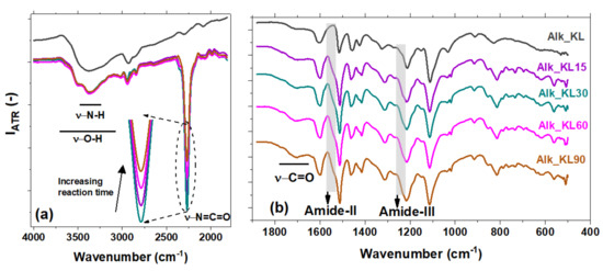 Figure 4 shows the same set of plots for the Alk_KL series. Once again, it was not possible to normalize the spectra with respect to each other; however, one may compare the proportional evolution of the peaks within the same curve. While in the Ac_KL derivatized samples the increase in the υ–N–H peak was accompanied by a decrease in the υ–O–H band, in the Alk_KL set the same proportion (i.e., υ–N–H/υ–O–H) was kept throughout the reaction time. This trend suggested that the reaction proceeded in a fast manner in the early stages of the reaction and then reached a plateau. Curiously, the N=C=O vibration peak did not follow the same trend as the υ–N–H/υ–O–H. While the latter overlapped, the intensity of the –N=C=O peak reduced with increasing reaction time, as highlighted by the dashed circle in Figure 6a.