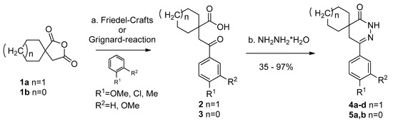 Realizing that the use of the nitrogen containing heterocycles and the spiro motif may be advantageous, a few spiro[cycloalkane]pyridazinone derivatives were synthesized by us (Scheme 1) [24,25]. Depending on the substituents, the starting anhydrides (2-oxaspiro[4.4]nonane-1,3-dione (1a) and 2-oxaspiro[4.5]-1,3-dione (1b)) were converted to the desired keto-carboxylic acids (2 and 3) either by the Friedel–Crafts reaction or the Grignard reaction. This was followed by the ring closure with hydrazine hydrate in refluxing ethanol to give the corresponding pyridazinone derivatives (4a–d, 4e and 5a,b) in high yields [24,25].
