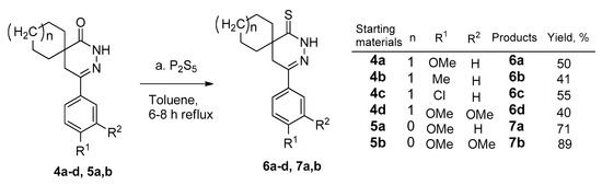 Phosphorus pentasulfide or the Lawesson reagent may be used for the thionation of an amide function [26]. The earlier described spiro[cycloalkane]pyridazinones (4a–d and 5a,b) reacted with phosphorus pentasulfide in the refluxing toluene. According to thin layer chromatography (TLC), the starting material was consumed after 6–8 h. After the workup comprising extraction, concentration, and preparative TLC purification, the products (6a–d and 7a,b) were isolated in yields of 40–89% (Scheme 2). The new compounds (6a–d and 7a,b) were characterized by 1H and 13C nuclear magnetic resonance spectroscopy (NMR), as well as high resolution mass spectrometry (HRMS).