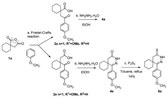During the preparation of the p-methoxyphenyl[spirocyclohexane]pyridazinone (4a), the isomeric pyridazinone derivative (4e) was isolated as a byproduct. The formation of the two isomers was explained earlier [24]. The thionation reaction with phosphorus pentasulfide led to the corresponding pyridazinethione (6e) in a yield of 14% (Scheme 3).