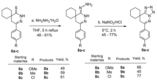 After reacting the thioxo derivatives 6a–c with hydrazine hydrate, the corresponding hydrazones 8a–c were isolated in 48–61% yields. The 4-(phenyl)-2,3-diazaspiro[5.5]undec-3-ene-1-thiones (6a–c) and hydrazine hydrate in THF had to be stirred at reflux for 5 h. It was observed that compounds (8a–c) were unstable when standing at room temperature. After a week, they began decomposing. However, after preparation, intermediates 8a–c were immediately reacted further in a diazotization reaction. The tetrazolo-pyridazinones (9a–c) were obtained in 45–77% yields (Scheme 4) after a preparative TLC purification. Compounds 8a–c and 9a–c were new and were characterized by 1H and 13C NMR, as well as HRMS. A similar method was applied in the sphere of benzodiazepines, where the extended conjugation helped the transformation [27]. In the case of spiro compounds 8a–c, the reaction was new.