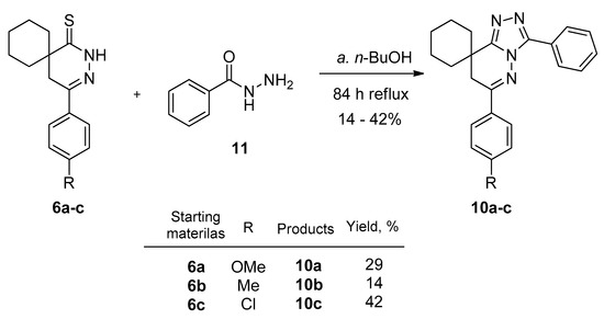 Our next purpose was to synthesize triazole derivatives starting from the thioxo compounds (6a–c). The thioxo compounds (6a–c) were refluxed with benzoic acid hydrazide (11) in n-butanol. After evaporation and chromatographic purification, the triazole-pyridazinone derivatives (10a–c) were isolated in yields of 14–42% (Scheme 5). This annulation technique was also applied in the sphere of benzodiazepines [33], where the extended aromatic conjugation may be advantageous for the reaction. Similarly to the preparation of tetrazoles, this reaction is new in case of spiro derivatives 10a–c. After the preparative TLC chromatographic separation, the three new products (10a–c) were characterized by 1H and 13C NMR, as well as HRMS. Table 3 summarizes the physicochemical parameters of the triazolo-pyridazinones (10a–c). The introduction of an additional aromatic ring increased the log P and clogP values, and decreased the Fsp3 character.
