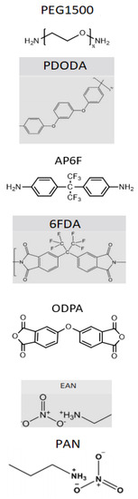 N,N-dimethylacetamide (DMAc), 4,4’-(1,3-phenylenedioxy) dianiline (PDODA) (oxygenated based diamine), 2,2’-bis (4-aminophenyl) hexafluoropropane (AP6F) (fluorinated diamine), 4,4’-oxydiphthalic anhydride (ODPA) (oxygenated dianhydride or ether-containing dianhydride), 4,4’-(hexafluoroisopropylidene) diphthalic anhydride (6FDA) (fluorinated dianhydride), poly (ethylene glycol) bis (3-aminopropyl) terminated (PEG1500)—number indicating the molecular weights of the PEG diamines, were purchased from Sigma-Aldrich. The ionic liquids ethylammonium nitrate (EAN (>97%)) and propylammonium nitrate (PAN (>97%)) were purchased from Iolitec. All the materials were used as received.