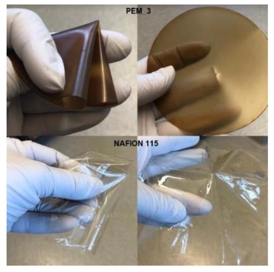 In Figure 2, the picture of the final product PEM_3 is shown and compared with Nafion 115 using the non-mechanical folding test. It can be seen from this figure that the membrane is very robust and easy to handle; in other words, it appears to have sufficient stability for practical usage, and it is also as flexible as Nafion 115. Flexibility is an important property to achieve for easy handling without ruptures. Thus, in the sample shown in Figure 2, the PEM_3 membrane is as flexible as Nafion 115. This is believed to be achieved as a result of the incorporation of PEG1500 into the structure.